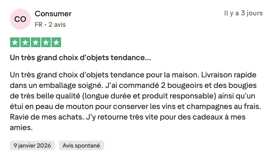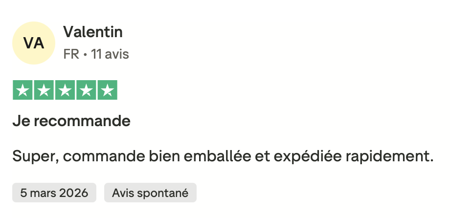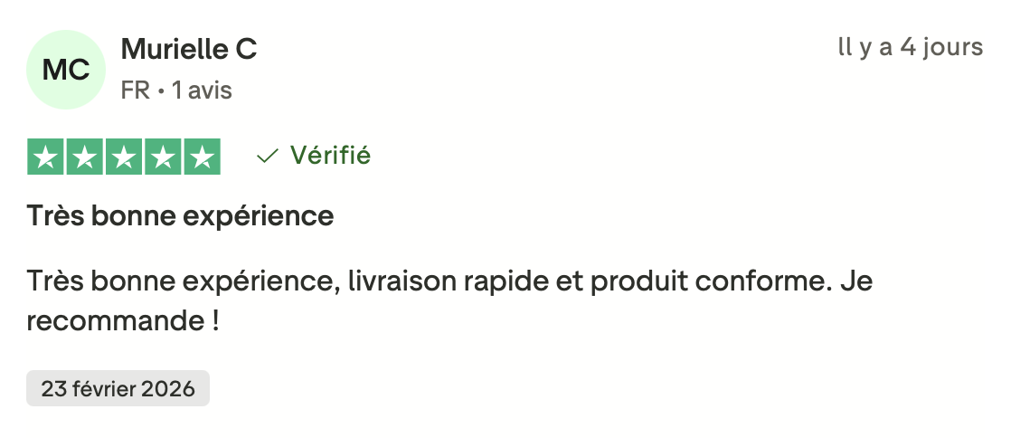 Tous les avis présents sur cette page proviennent de clients ayant réellement commandé chez nous. Ils sont collectés et vérifiés via Trustpilot, une plateforme indépendante spécialisée dans les avis consommateurs, garantissant ainsi leur authenticité et leur fiabilité.